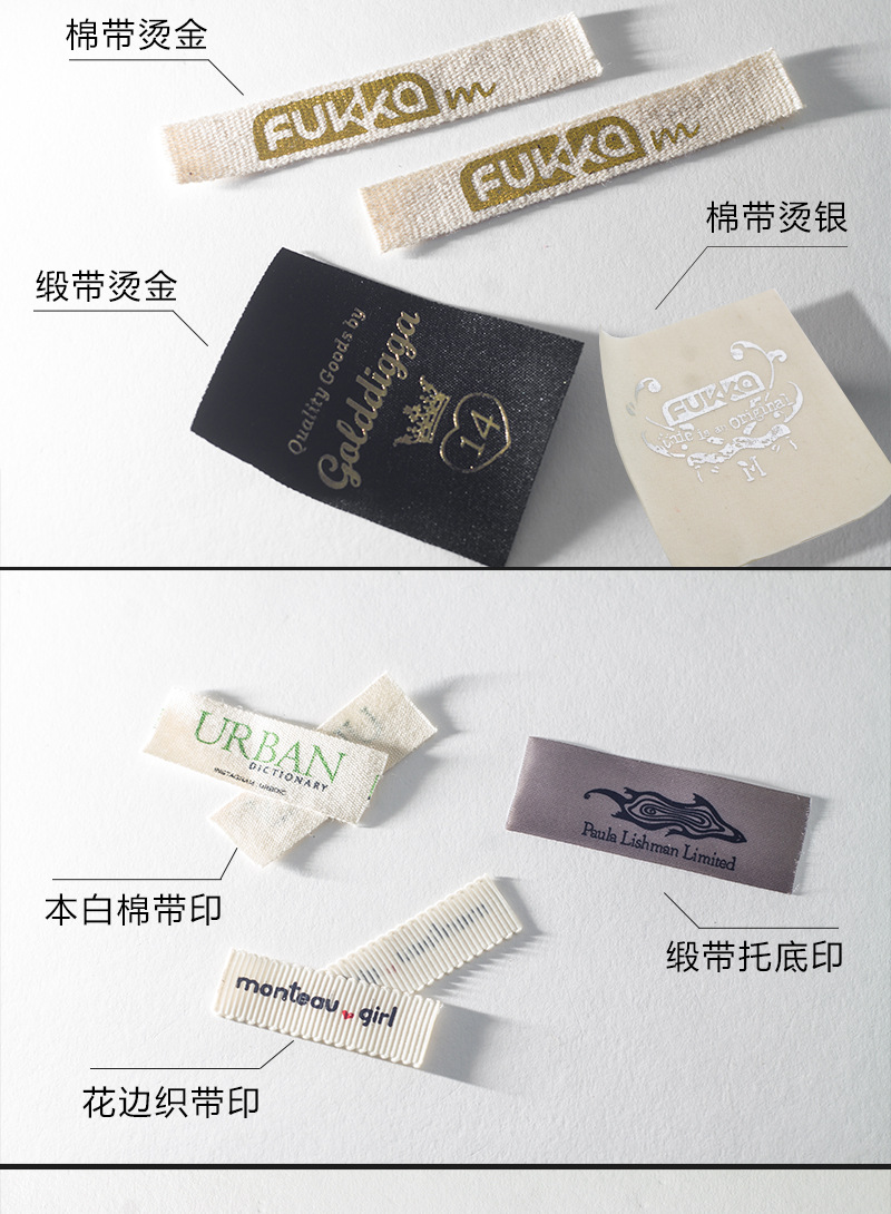 印嘜布標:廣東服裝印嘜廠家通過油墨印刷來表達文字,圖案及LOGO。可采用的材料非常廣泛。有棉帶,絲帶,緞帶,膠帶等等。作為服裝的嘜頭(也叫作領標,主嘜,主標,領嘜),一般用棉帶與緞帶。