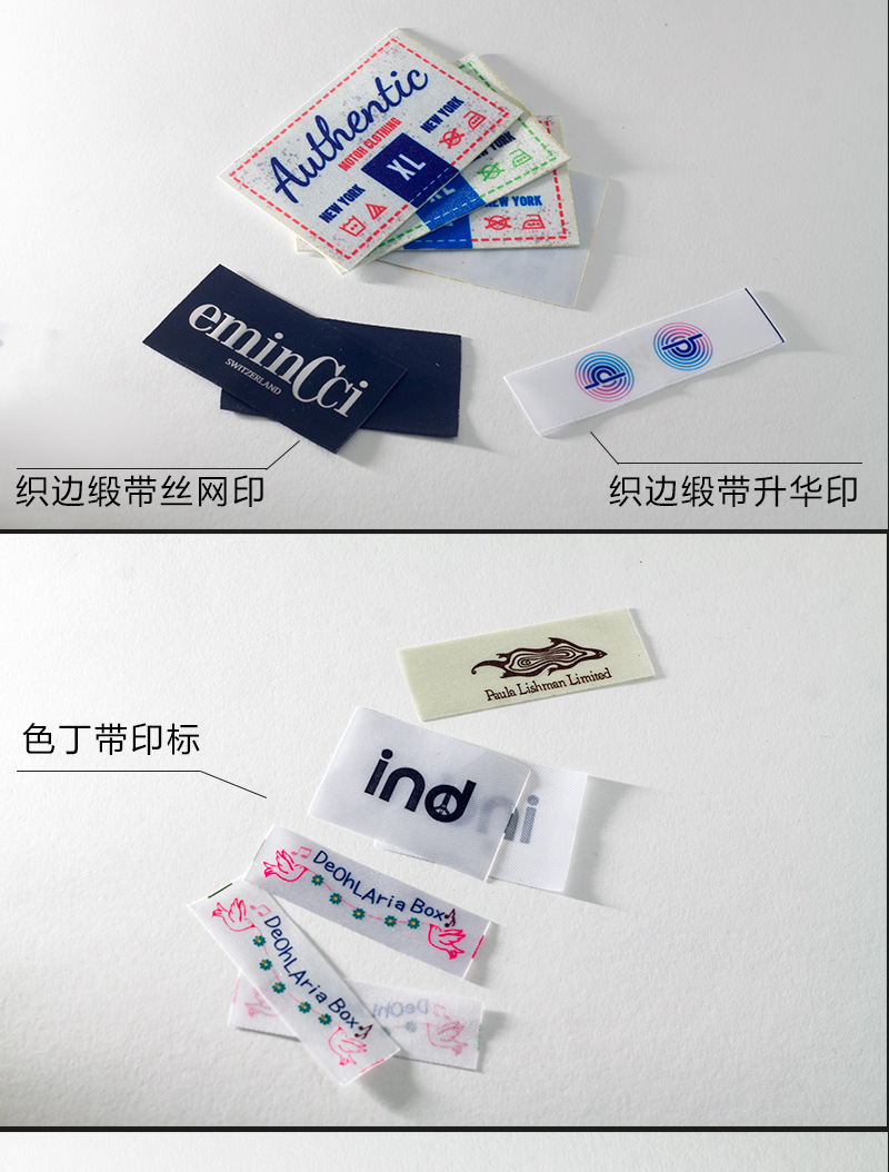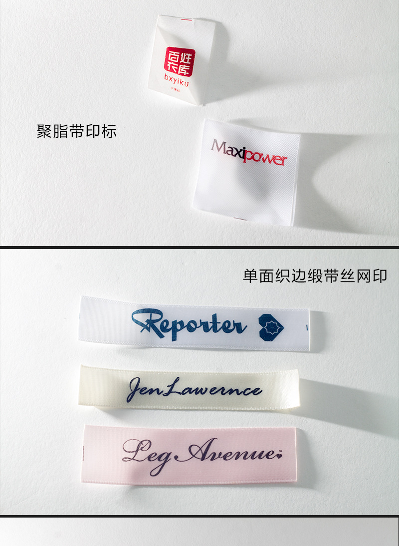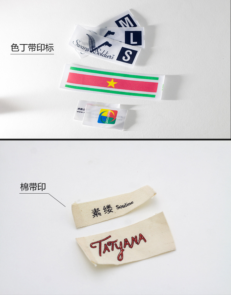 ——印嘜布標:廣東服裝印嘜廠家通過油墨印刷來表達文字,圖案及LOGO。可采用的材料非常廣泛。有棉帶,絲帶,緞帶,膠帶等等。作為服裝的嘜頭(也叫作領標,主嘜,主標,領嘜),一般用棉帶與緞帶。
