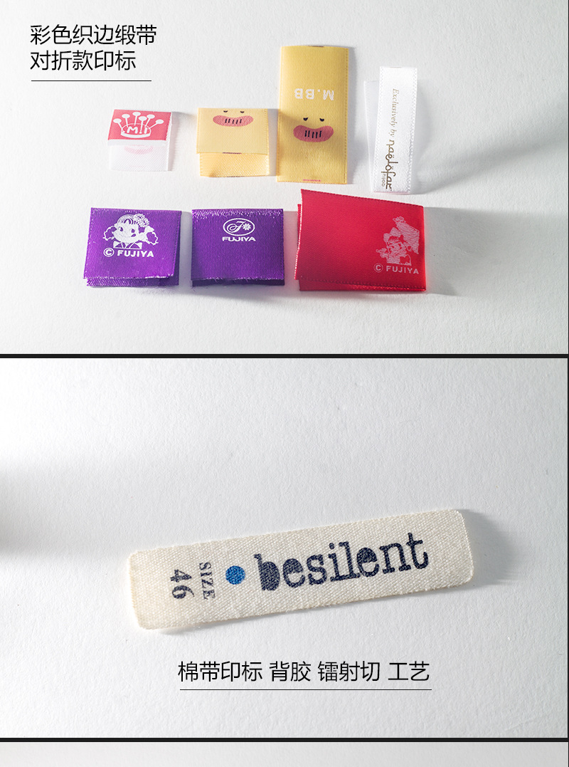 印嘜布標的優點:一是采用純棉帶與緞帶,材料天然環保,面料柔軟高檔不割手,是高檔服裝的首選;二是采用環保的油墨印刷,色彩得以完美展示,圖案及文字LOGO的顏色與形狀展現得淋漓盡致。三是采用現代高科技印刷機器配以本廠先進的技術,使得印刷的內容色牢度也非常強,可通過水洗,石磨都不會掉色。